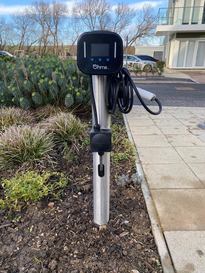 Having recently moved into a new home just outside Reading Peter contacted us to install a new charge point for his company car. With his parking space situated away from his property and the other side of a shared footpath Peter needed a solution which would allow him to charge his car without trailing cables across the footpath. We worked with Peter, his iDNO and the managing agent of the estate to complete the installation of his new Ohme Home Pro charger including all groundworks and permissions. We recommended the Ohme Home Pro as Peter’s wi-fi signal would not reach the remote parking space and the Ohme uses a 4G SIM for connectivity.